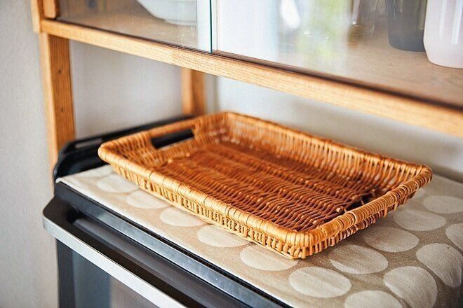増えたり減ったりする「イレギュラーな物」の置き場所を決めると、出しっ放しが防げます。お土産、パン、バナナなど、しまうと食べ忘れてしまいがちな物はこのカゴへポン!