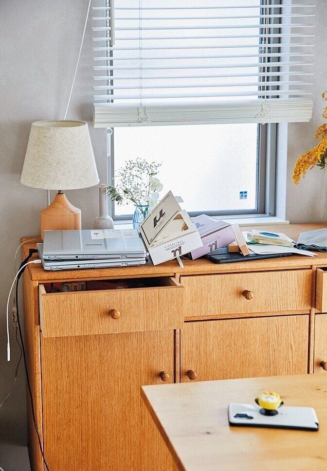 文具のほか、夫の持ち物、薬や母子手帳など、ここで使う細かい物はすべてチェストの中に定位置をつくっています。移動せずに、パパッとしまえるからラク。