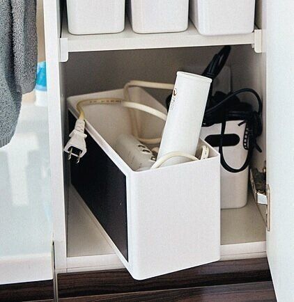 コードがかさばるドライヤーは、ファイルボックスにサッと入れることに。腰の高さにするのも、出し入れしやすくなるポイントです。