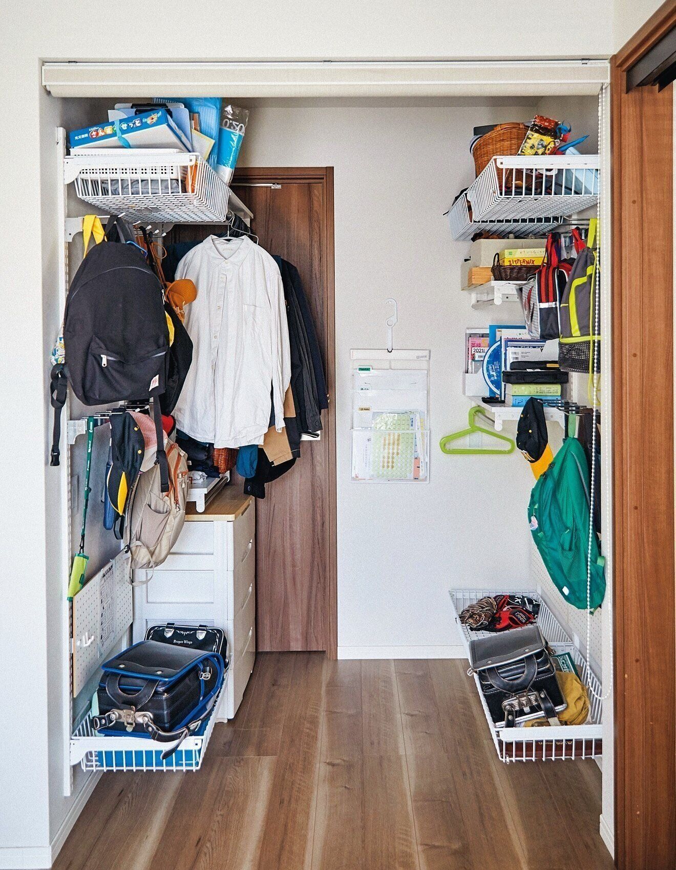 リビングの隣の部屋に、二男と三男の服と持ち物をまとめています。ランドセルはフックにかけるのも引き出しにしまうのも無理だったけれど、ポンと置くだけにしたら、戻せるようになりました。