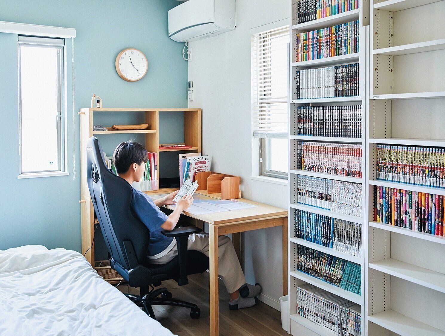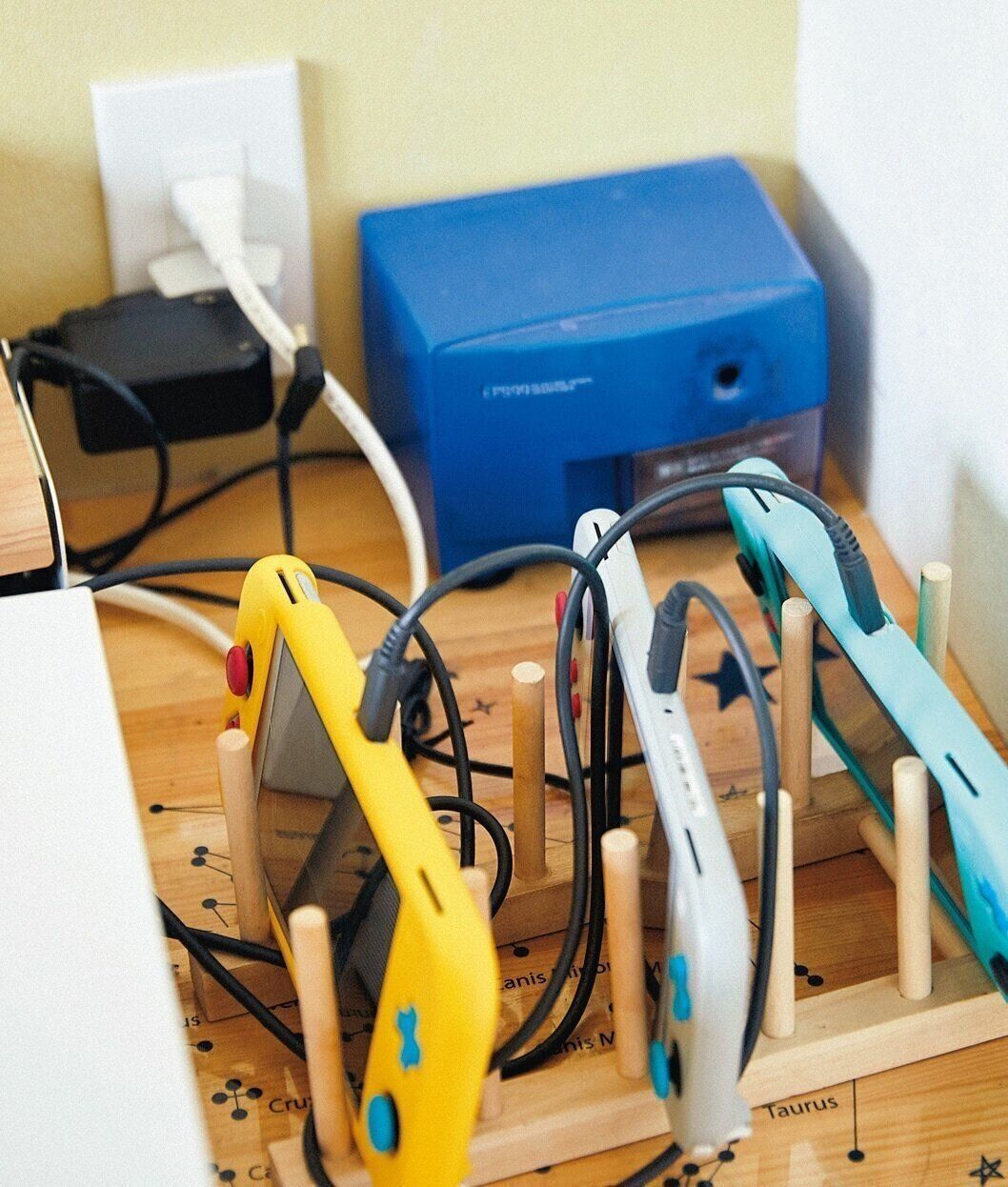 ゲーム機置き場はスタディコーナーのデスクのすみっこ。「充電しながらスタンドに立てる」収納に。子どもたちは次に遊ぶときまで充電をしたいから、自らすすんで片づけます。