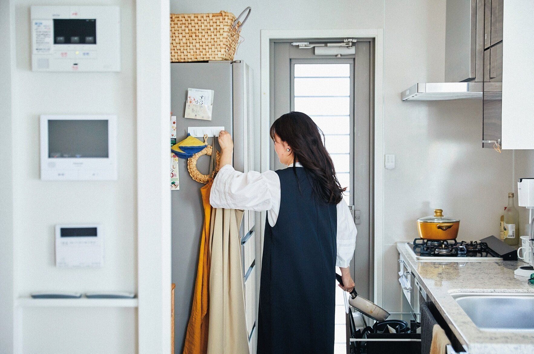 キッチンでいつもエプロンをしているわけではないオギャ子さんが、「エプロンしなくちゃ!」と思うのは、コンロで炒めものをするとき。だからエプロンは振り向けば手が届く冷蔵庫の横にかけています。