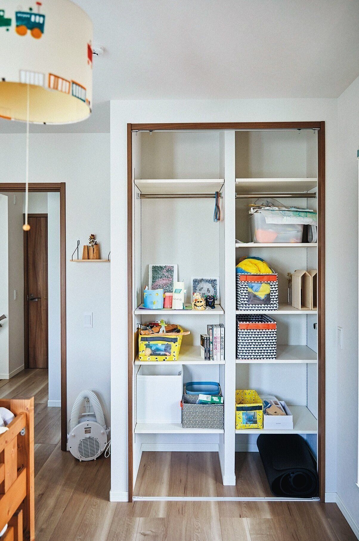 服はリビングの隣の部屋にしまっているから、子ども部屋のクローゼットにはおもちゃを収納。扉を外したら何があるかがすぐわかって、遊んだあとはポンと置くだけ!