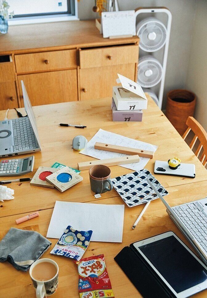 子ども3人、夫婦で在宅勤務だから、夕方のダイニングはカオスだけれど、夕飯前に「とりあえず」よけておき、夕飯後の後片づけの「ついで」にリセットをすれば、毎日、元どおりに!