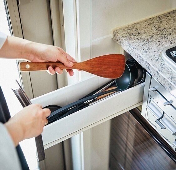奥の細長い引き出しにキッチンツールがシンデレラフィット