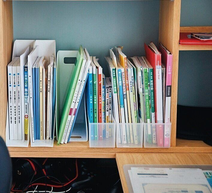 ファイルケースは、手前に立ち上がりのないタイプや透明の物を選んで背表紙を隠さないようにすると、パッと見で何の本かわかり、出し入れしやすい。