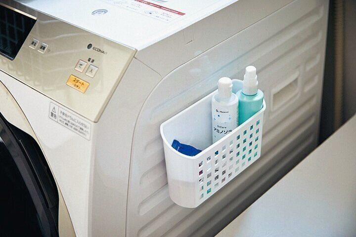 本来は、鏡の扉の中にしまってほしいけれど、それだと出しっ放しになるから、洗濯機の側面にサッと戻せる場所をつくりました。