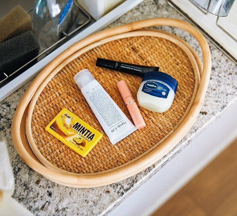 キッチンカウンターに、ついつい置いてしまう物たちは、そのまわりに定位置をつくれば、秒で戻せます。ハンドクリームなど細かい物は、トレーの中なら置きっぱOK。