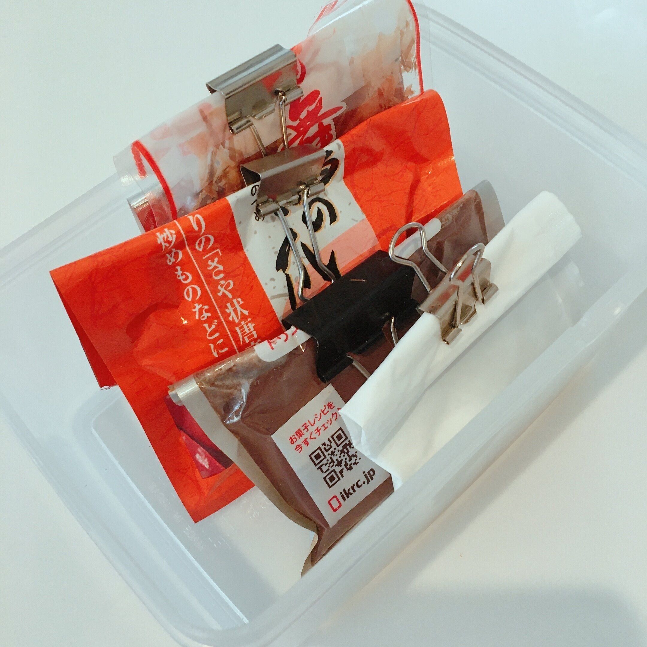 それを防止するために封を開けてしまった食材をまとめて入れておくケースを用意しました。使い古したタッパーを使っています。このケースのおかげで2度買いがずいぶん減りました。