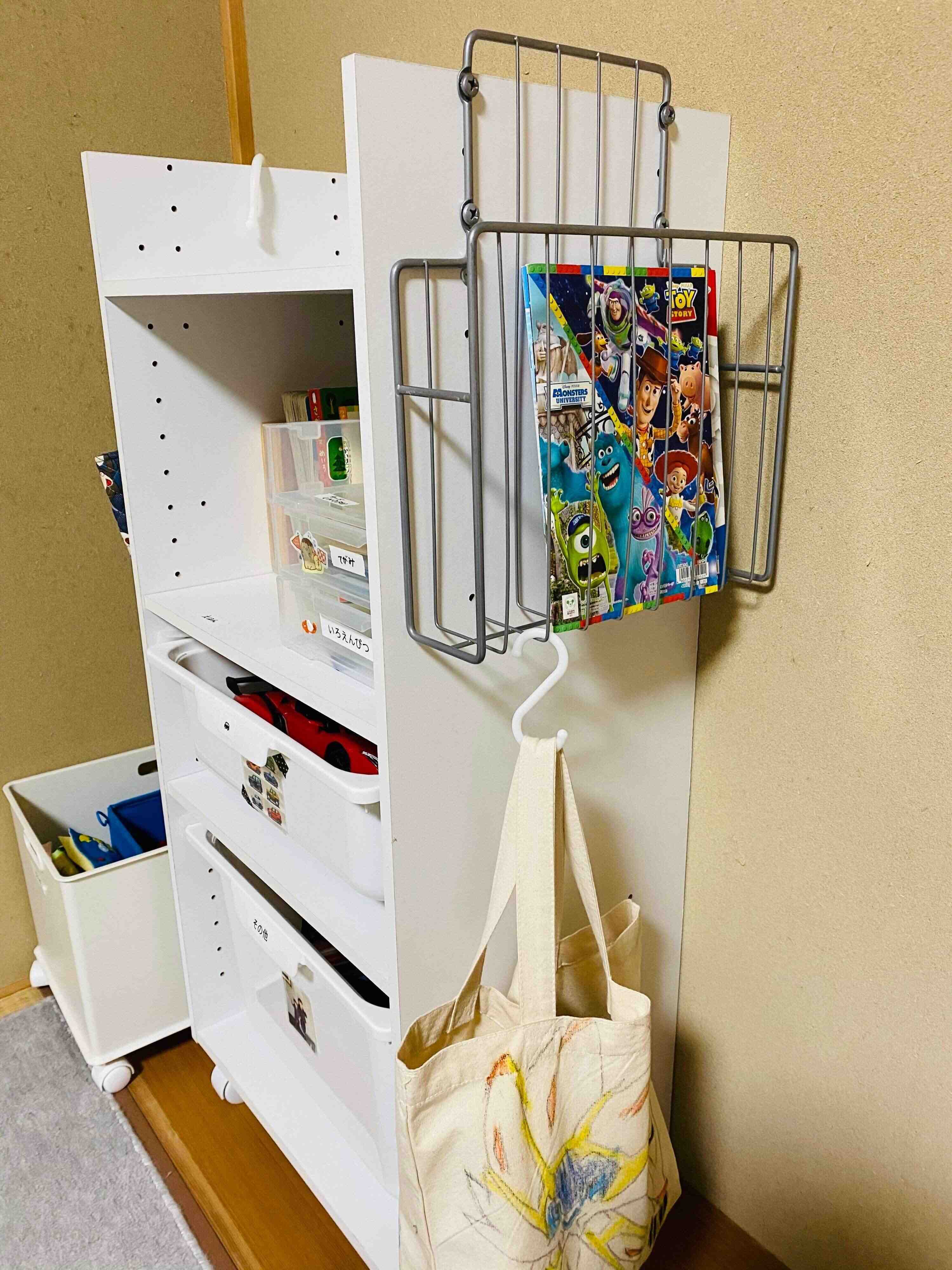 おもちゃ入れとして使っているこちらのカラボは子どものぬり絵やスケッチブックなどを入れています。