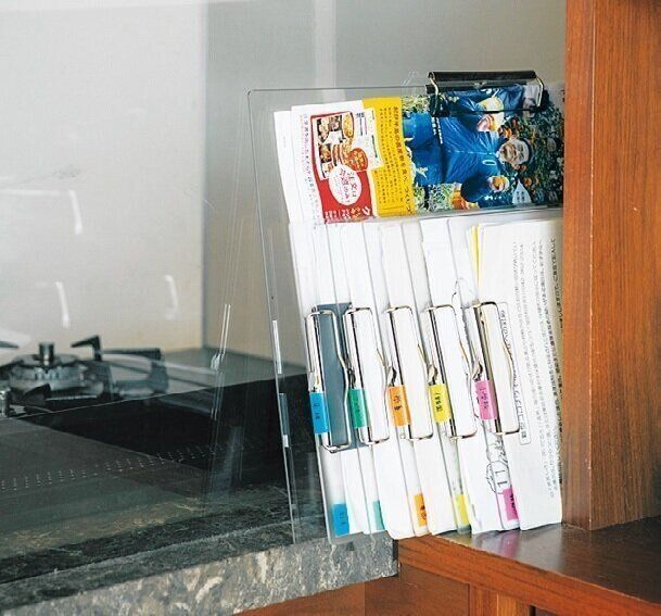 キッチンカウンターと壁面棚のすき間が定位置。保育園、学童などのラベルがひと目でわかるように並んでいるからパッとはさめます。