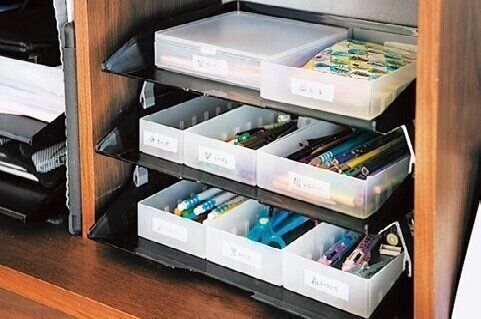 細かい文具は、トレーごとテーブルに置いたりしまったりができるように。