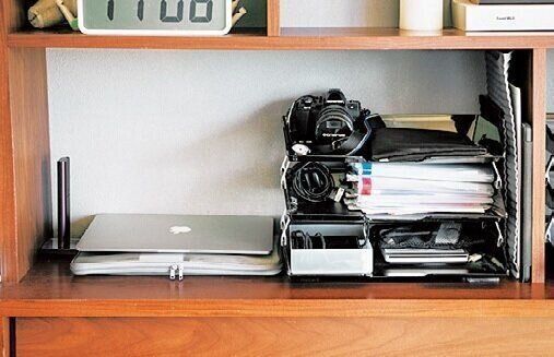 レタートレーの上段はカメラと郵便物、中段はレシート類、下段はデジタルアイテムが。