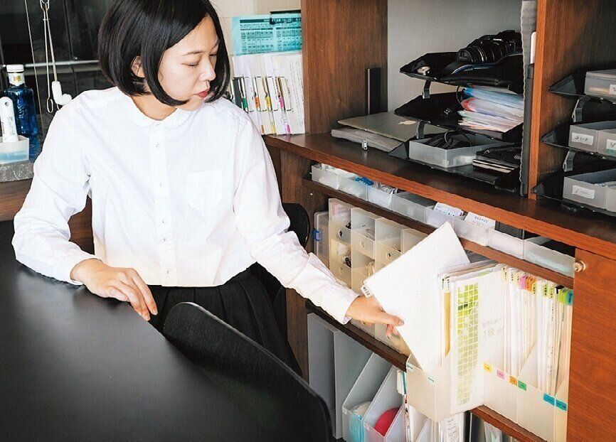 仕事、学校、お金まわりなど、すべての書類がいすに座ったまま出し入れ可能な状態。「カラーBOXなどでもいいので、1カ所にまとめると確認もすぐできて、ラクになりますよ」。