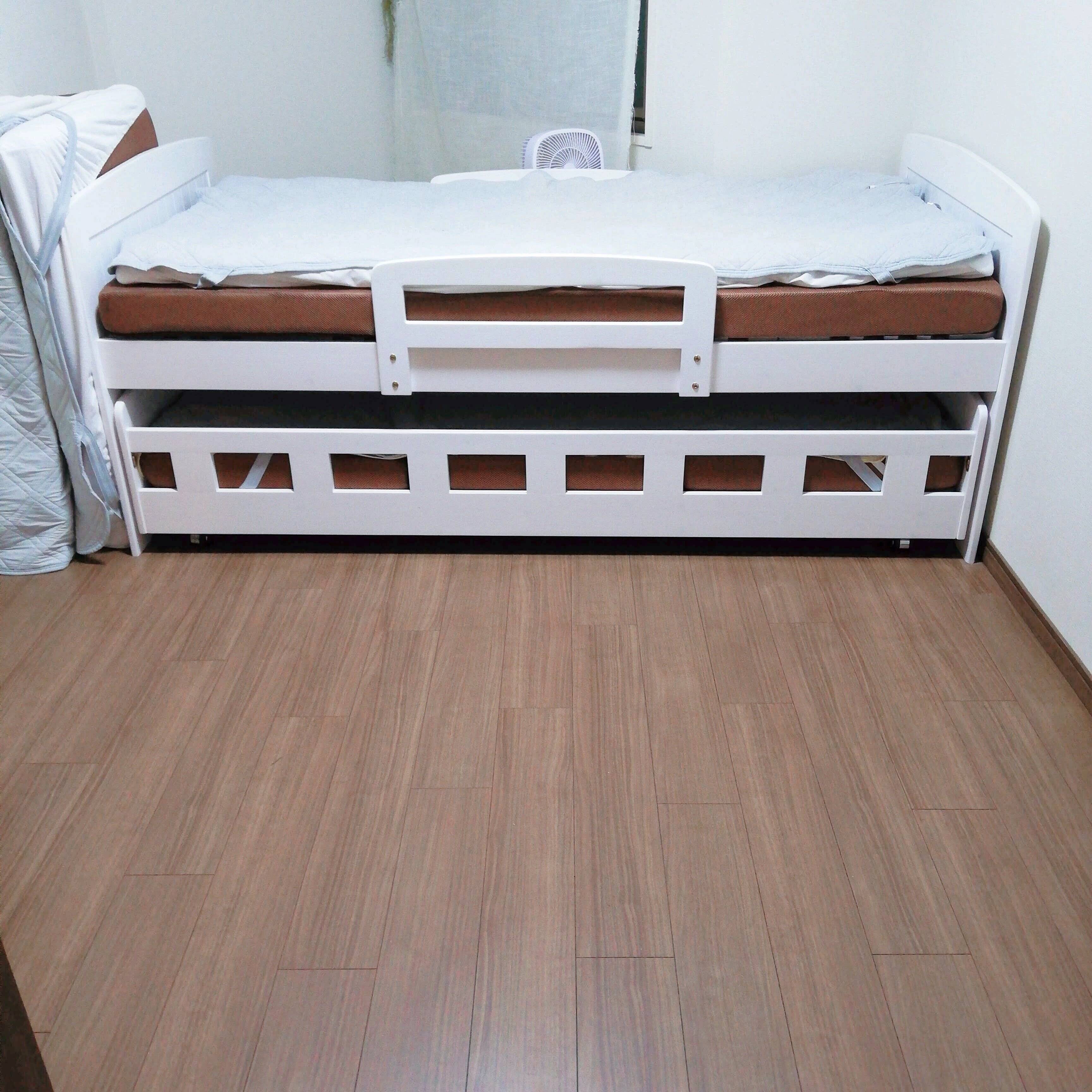 元々はダブルサイズのベッド1台に親子3人で寝ていましたが、窮屈になったことと、当時1歳の息子が転落してしまったことをきっかけに手放しました。
