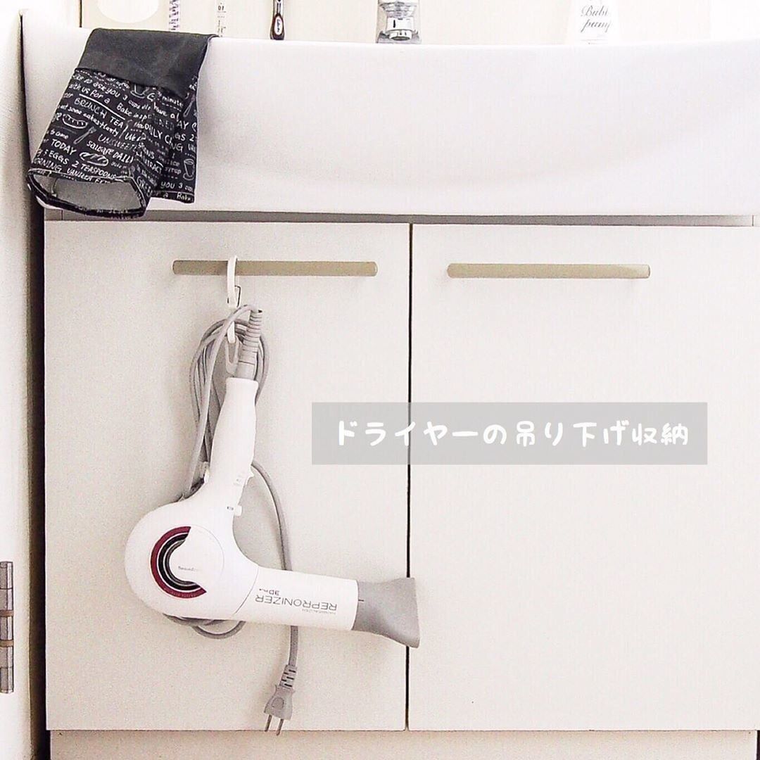 洗面所で使うドライヤーもかさばるため置き場に困るアイテムの1つです。ドライヤーの置き場に困ったら、「吊り下げて」収納してみましょう。