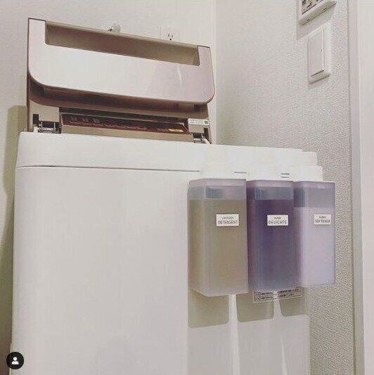 洗濯に使う洗剤や柔軟剤などものが多い脱衣所におすすめなのは、「洗剤を洗濯機に貼り付ける」方法です。
