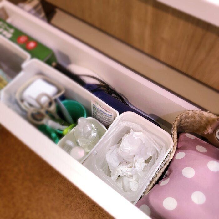 引き出しの中に入るサイズの収納ケースをゴミ箱として活用しましょう。掃除の際にゴミ箱が邪魔になることもなくなります。