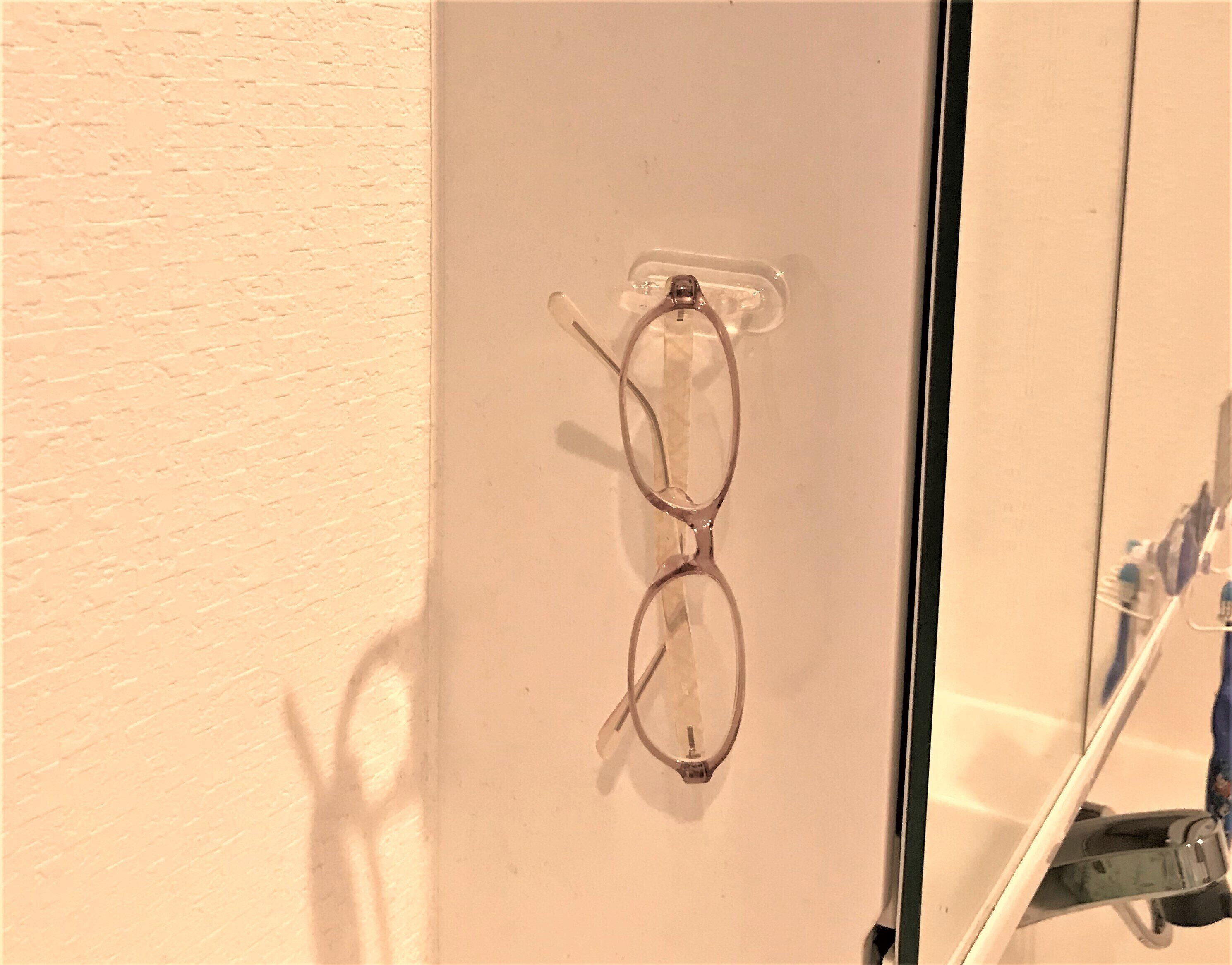 ついついその辺に置きっぱなしになってしまうメガネも、定位置が決まるとスッキリキレイ!繰り返し貼ってはがせるセリアの「何度でも貼ってはがせるフィルムリングフック」(税込110円)です。