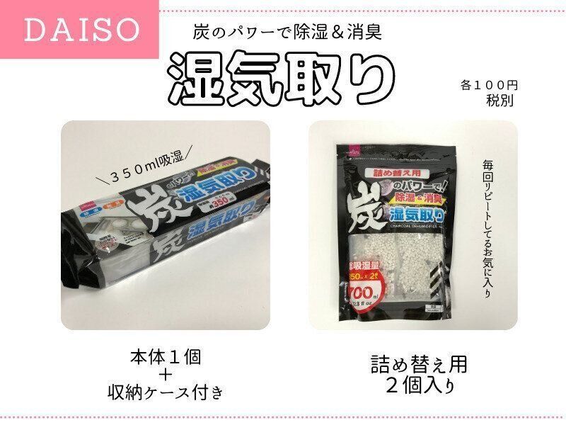 シーズンを通してリピート購入しているDAISOの湿気取りアイテムです。中身が満杯になったら詰め替え用をに交換すればいいのと、使い終わったときのゴミが少ないのもお気に入りポイントです。