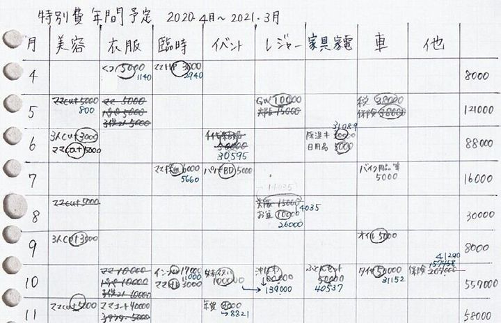 年度末の3月に、特別出費の予定一覧表を作成。「この月は特別出費が多いから、貯蓄できるのはこれくらいと予測できるので、月貯蓄額に変動があっても焦らずにすみます」。