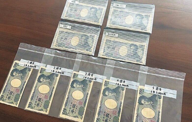 月1回、給料日に現金でやりくりする分を口座から下ろして千円札に両替。夫小遣い、5週分の生活費、医療費、ペット費、車費などに振り分けます。「使っていいのはここにある分だけだから、使いすぎません」。