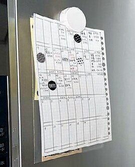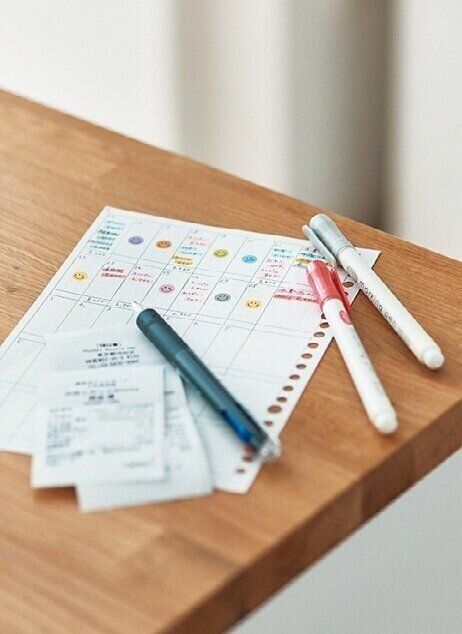 無印良品のルーズリーフに線を引いて、1カ月分がカレンダー方式で1ページに収まる家計簿を自作。費目ごとに使った金額をざっくり記入して、週末に集計。「キッチンカウンターで立ったまま書き込めるので冷蔵庫横に貼ってます。ラクだから続けられるんですね」。