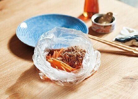 袋の中に食材を入れ、そのままレンチンや湯せんで調理OK。「使い捨てだから鍋を洗う手間がないし、時短で作れて便利ですよ」。