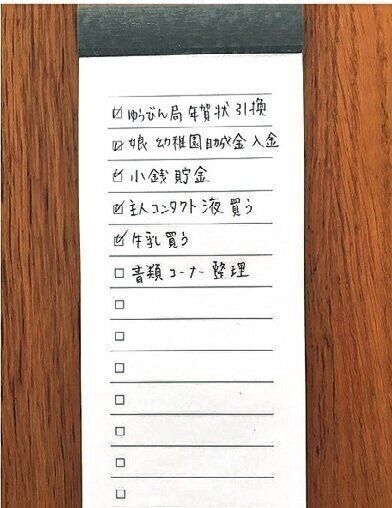 やるべきことを書き出して、やり終えたらチェック。「面倒なことでもリストにすれば重い腰が上がり、やりくりや用事がサクサクすむように!」。