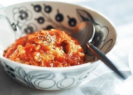 生米を炒めて煮るリゾットなら、お米をといで浸す手間も、炊飯器の内釡を洗う手間もなし。「お気に入りの器によそえば外食気分に」