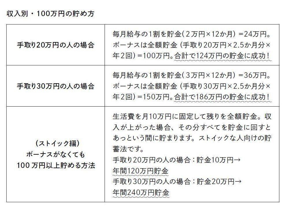 貯蓄を始めたいなら、まず1年間で100万円貯金を目標にするといいと思います。現実的な額で100万円というキリのよい目標額は、やる気を高めてくれますし、達成できると貯蓄が楽しくなります。