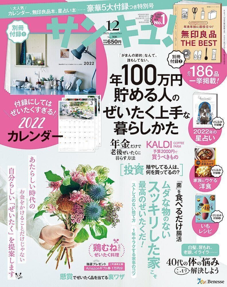 『サンキュ!』12月号は、「あたらしい時代の自分らしい『ぜいたく』」がテーマ。読者の方々から最も反響が寄せられているのも、巻頭特集「年100万円以上貯めている人ほどぜいたく上手でした」です。