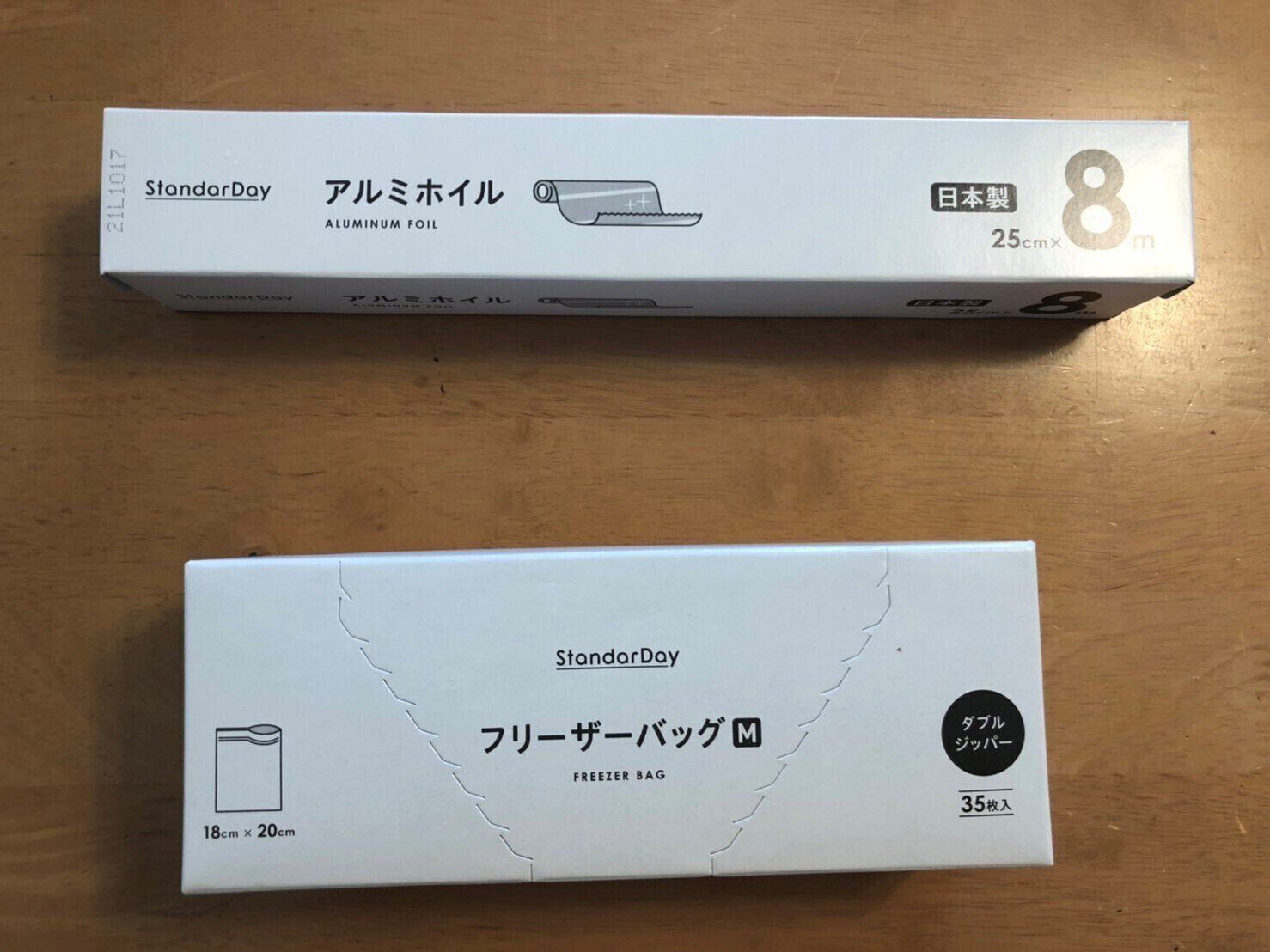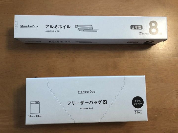 今回購入したのがアルミホイルとフリーザバックM。シンプルなのでキッチン雑貨をしまっている引き出しを開けてもスッキリ。