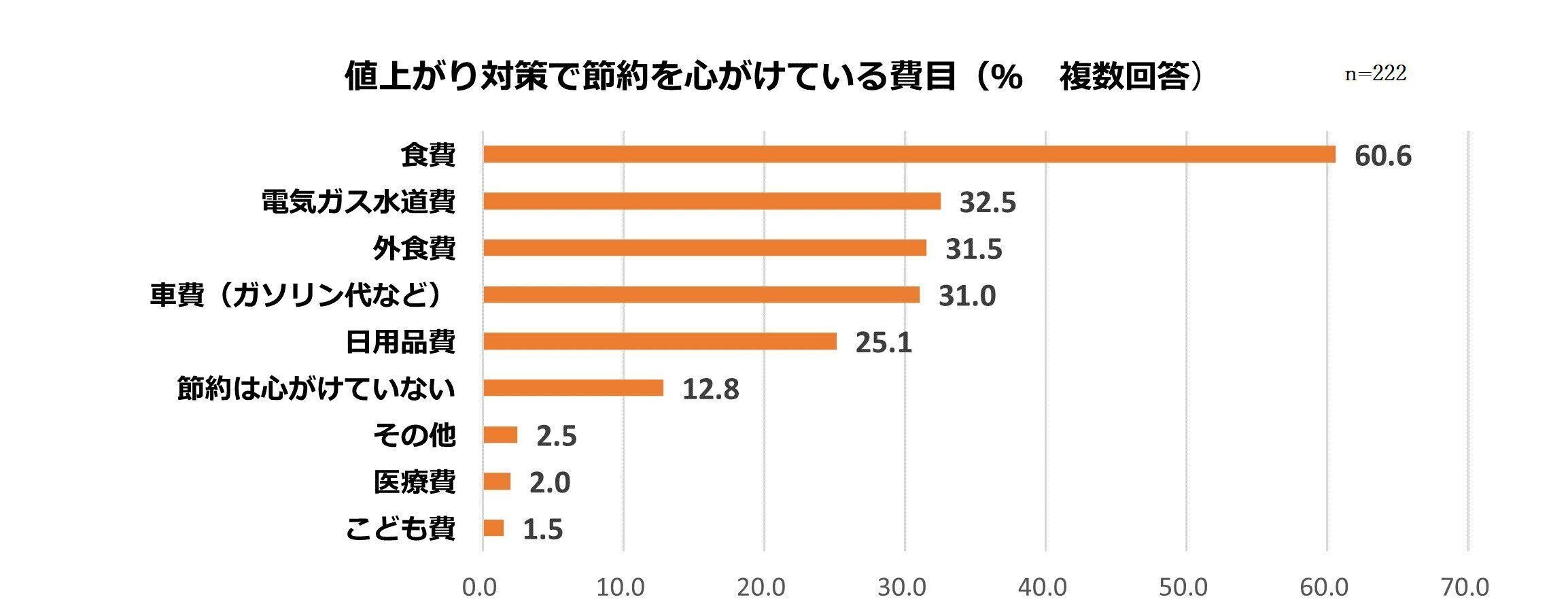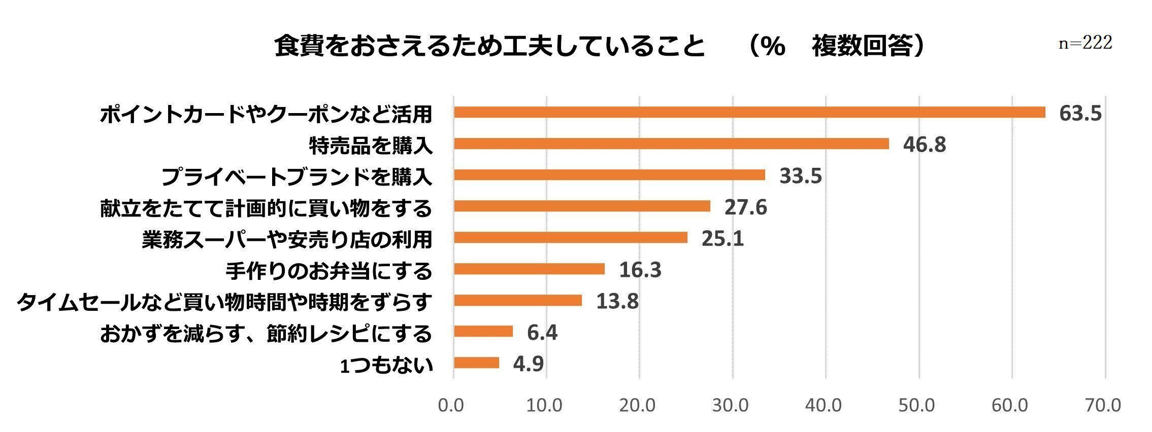 2.値上げ対策1位は、食費をおさえる。ポイントやクーポン利用のほか献立をたてるなどでも対策