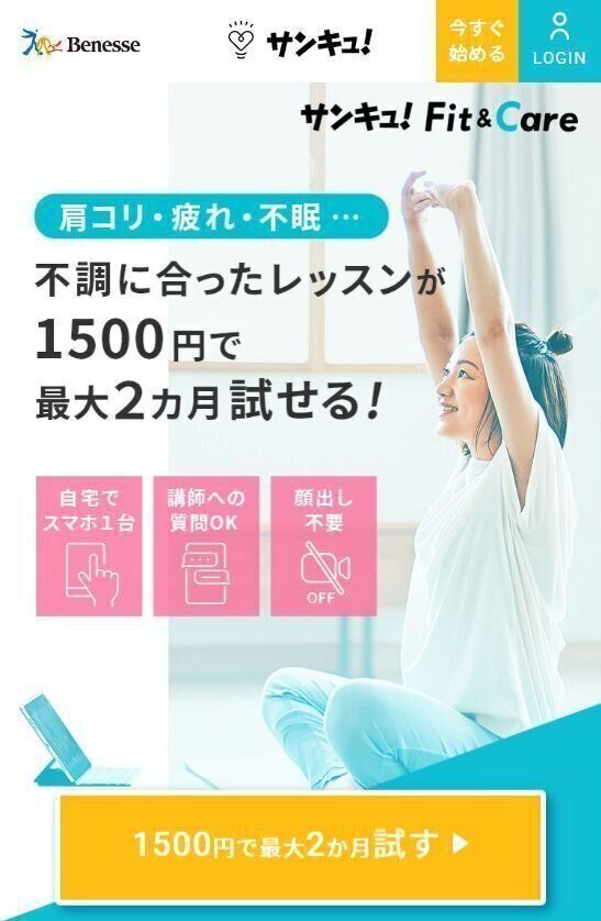 悩みに合ったオンラインレッスンをリコメンドし、整体師、理学療法士、瞑想講師、ヨガインストラクターなど、プロ講師によるレッスンをリアルタイムで配信、初月はお得に始められます。