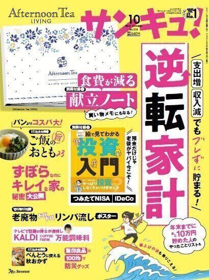 昨年大好評だった食費がみるみる下がる献立ノート。今年は人気の時短節約家のくうちゃん監修はそのまま、デザインはAfternoonTea(アフタヌーンティー)とコラボで登場。ダメ家計から脱出した逆転家計の特集のほか、サンキュ!史上最もわかりやすい投資入門付録など、値上げに負けない家計を応援する5大付録つき 特別価格660円