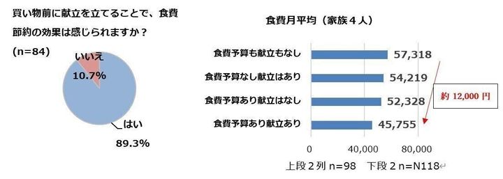 ●献立をたてることで、食費の節約効果を感じる人は約9割だった。調査では、食費の予算と献立をたてている家庭が最も食費が安くなるという結果となった。