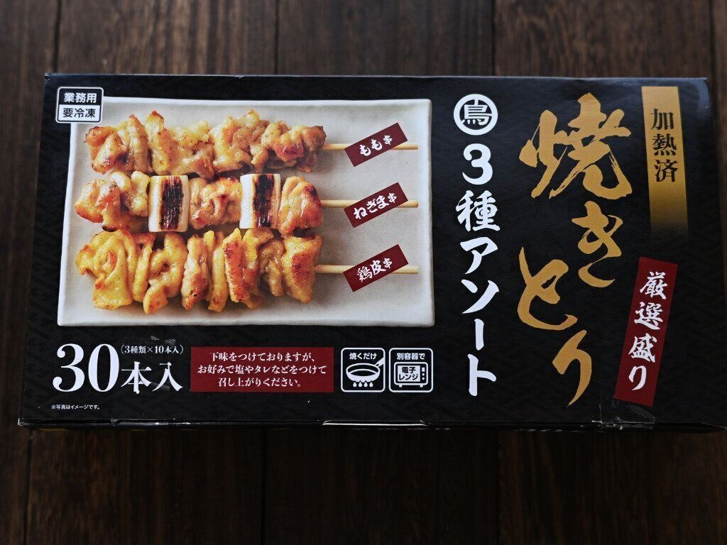 次にご紹介するのは「焼きとり3種アソート」。鶏皮、ねぎま、ももが30本も入っていて、焼くだけでお酒のおつまみはもちろん、ご飯のおかずに大活躍!