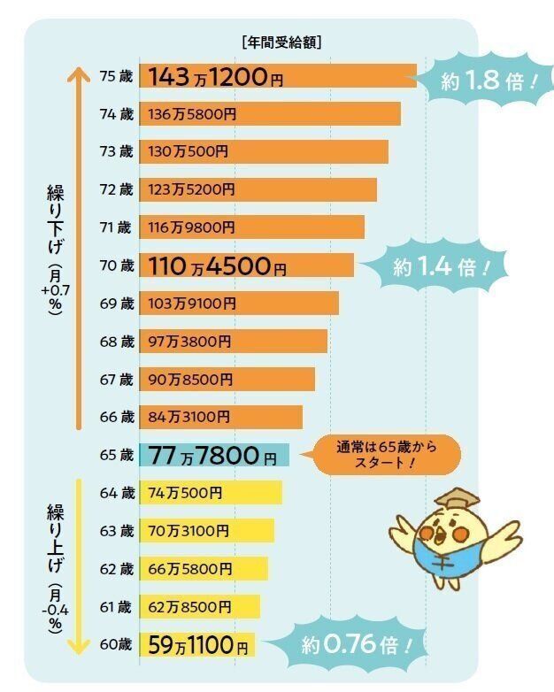 年金の受給は65歳からですが、前倒し、後ろ倒しもできる。「後ろにすることを"繰り下げ"といい、遅いほど受給額がアップ。老齢基礎年金、老齢厚生年金ともに可能で、4月からは繰り下げ年齢が70歳から75歳へと広がります」。