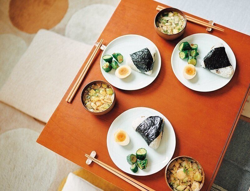 休日のランチ。以前は家族4人でにぎやかにテーブルを囲みましたが、今は3人に。「4人分が3人分になったので、その分、お米代や食材費が少しだけ減ったような気がします」。