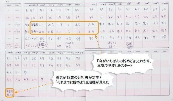 「家族の年齢を書くだけで、夫の定年の時期が意識できるように。今から教育費と老後資金を同時に貯めていくためにどうしたらいいか考えるきっかけに」。