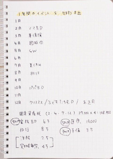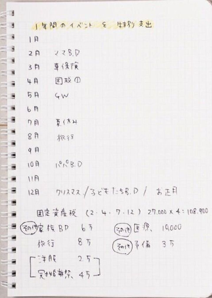 年間でかかるイベント費や税金など支出予定を書き、必要な積立額の目安を設定。「この積み立てがあることで、先取り貯蓄を死守できます」。