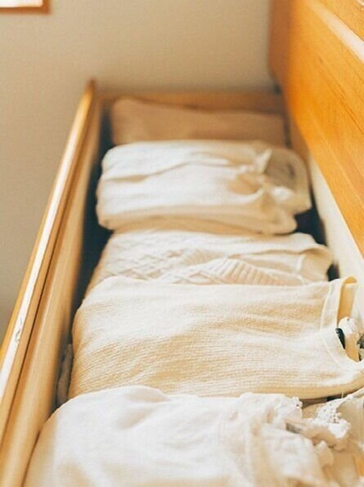 40代になってから、トップスは肌色がよく見えるオフホワイト系を定番に。「今の自分に合う物、家族が必ず使う物を決めておけば、自然とムダな買い物はしなくなります」。