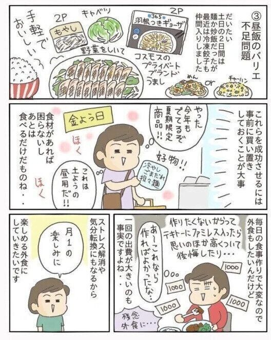 でも、休みの日のごはんづくりは休みたい…ということで、市販のレトルト品などをうまく使って楽をするという工夫も。金曜日に休みの日のランチの食材を買い置きしておくようにしました。