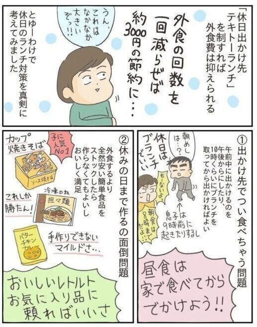 休日の外食の回数を減らすにはどうすればいいかと考えた松山ルミさん。外出するとつい外でランチとなるため、午前中を家で過ごし、そのまま家で昼ごはんを食べて午後からお出かけ、と行動を変えてみたのです。