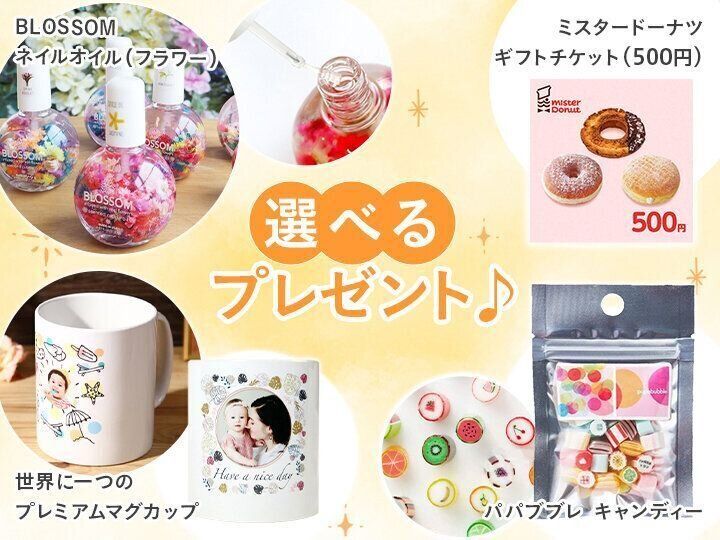 セミナーは選べるプレゼントつき♪ ミスタードーナツ 500円ギフト券、パパブブレのキャンディーなどから選べます。