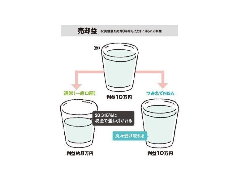 一般口座や特定口座で投資した場合、仮に10万円の利益が出たとき、そのうち2万円程度は税金として差し引かれます。「つみたてNISA」なら10万円がそのまま受け取れます。