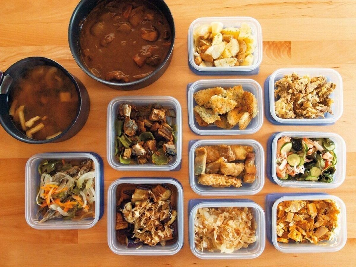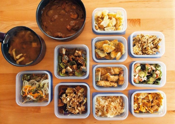 食材宅配で1週間分の食材を頼み、日曜朝に12種類の作り置きを。「平日のべんとうと夕食は、ほぼこれでまかないます。週の途中、余った食材で汁ものを作り足すくらい。土日はチャーハンやパスタで乗り切ります」。