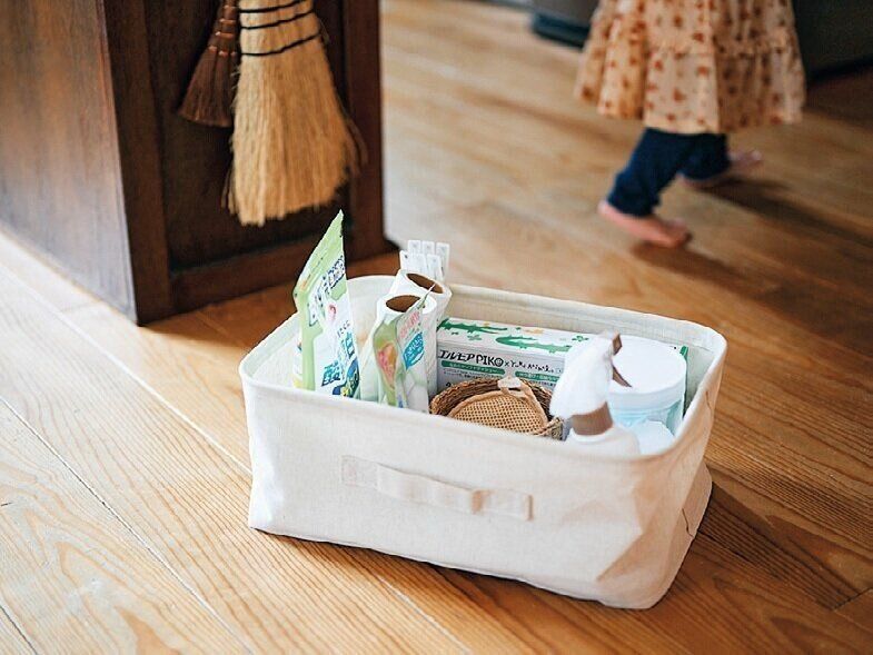 「ストックが多いと置き場に困るし、気が大きくなってムダに使いすぎちゃう。使用中の物が残り半分になったらメモし、次の買い出しで買うルールに」。合わせてボックス1つ分なら、管理もラク。