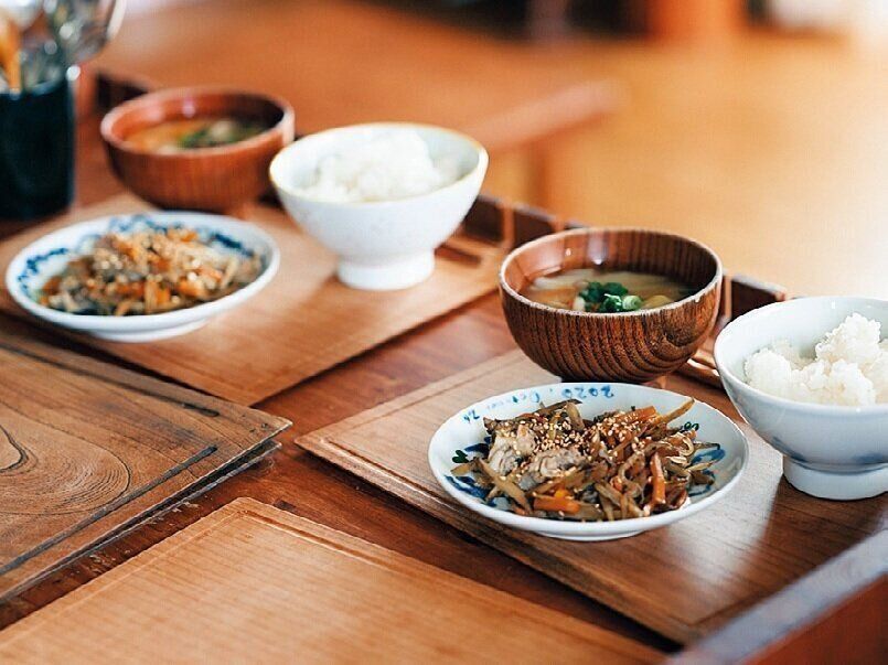 平日の夕食はご飯とみそ汁、おかず1品。「土井善晴さんの本を読み、一汁一菜のよさに納得。"日本昔ばなし"みたいな食卓ですが、作る負担が少なく、体にもお財布にも優しいです」。